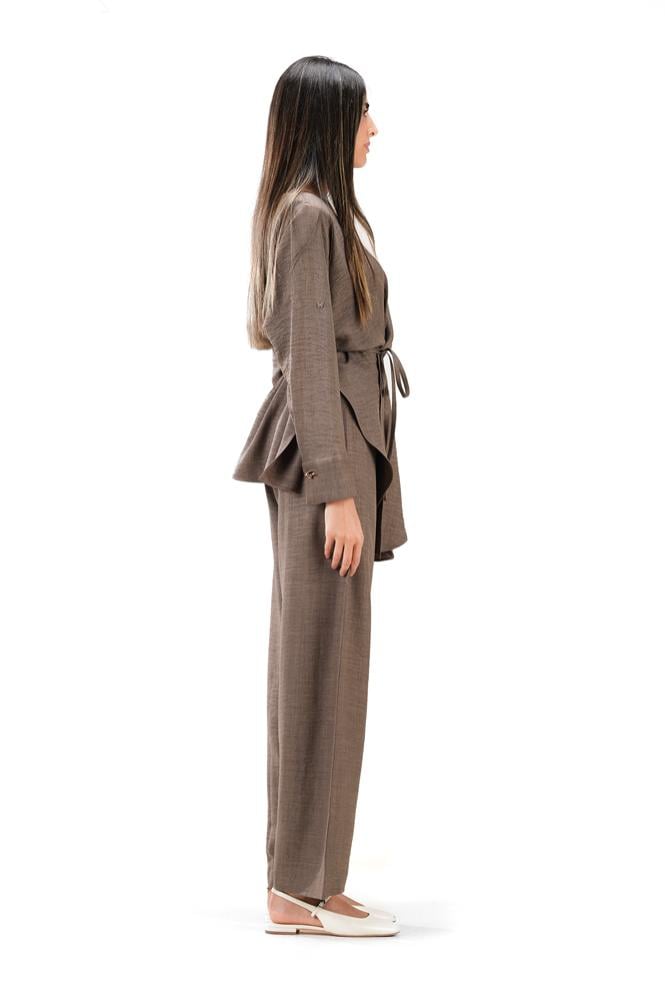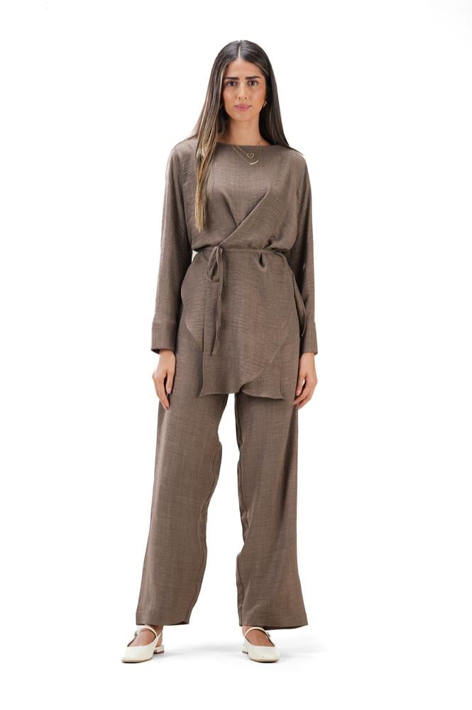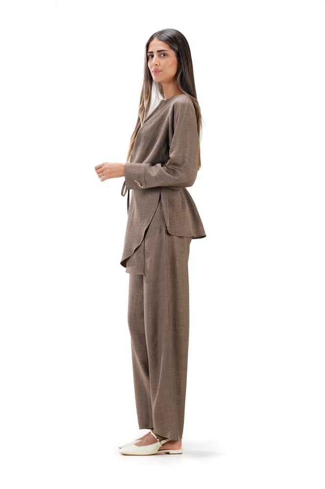 وصف المنتج: طقم صيفي عملي وانيق مكون من بلوزة وبنطلون ، مصنوع من قماش كتان بوليستر المغسول الذي يتميز بالليونة والنعومة والتهوية الجيدة ، البلوزة مزوّدة بربطة تضيف لمسة أنثوية وتسمح لك بتعديل شكلها حسب الرغبة، كما تحتوي على زر ذهبي على الكم يضفي لمسة فاخرة وملفتة للنظر ، البنطلون مصمم بتفاصيل بسيطة ومريحة تتناسب مع جميع الإطلالات المحتشمة ..
