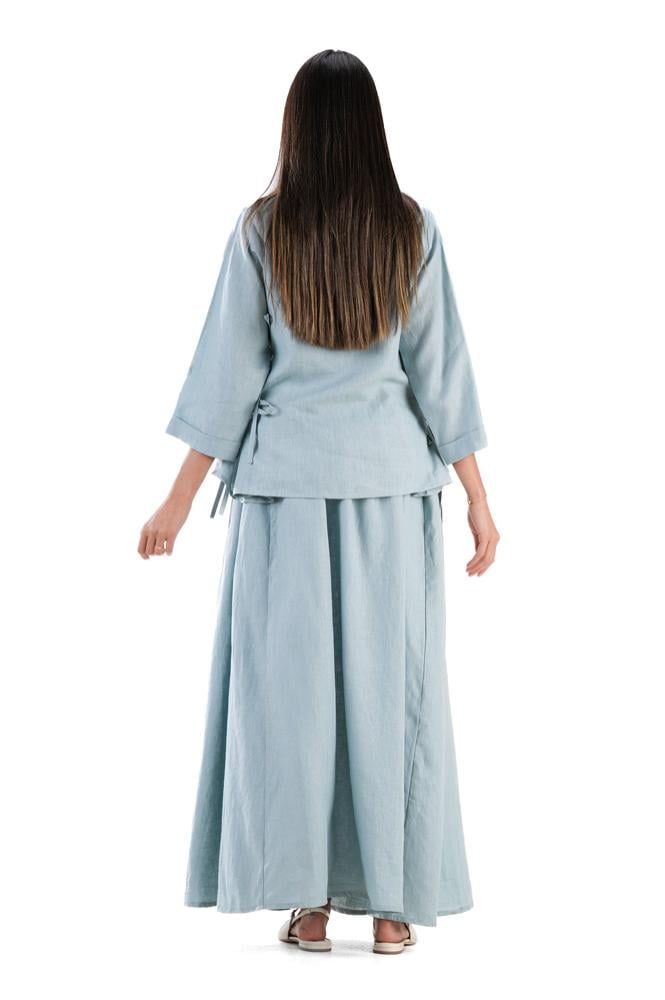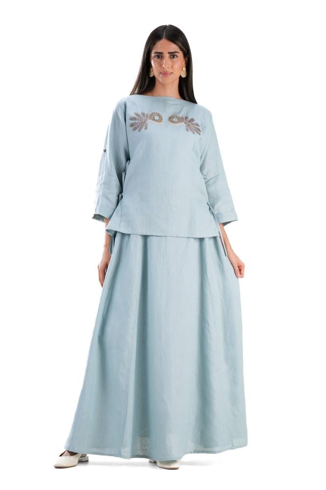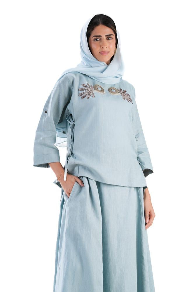 وصف المنتج: طقم أنيق من قطعتين مصنوع بقماش اللينن صُمم ليمنحك الراحة في جميع الأجواء، خصوصًا في الأجواء الحارة والرطبة ، يتكوّن من بلوزة مطرزة من الأمام بتطريز متقن بخيوط فاخرة مستوحاة من أجنحة اليعسوب التي تتحول إلى بتلات، مع أربطة جانبية أنيقة تمنحك حرية تعديل المقاس بما يتناسب مع شكل جسمك، لتجمع بين الراحة والمظهر الجذاب كما يكتمل الطقم بتنورة منسقة مع زم جانبي تمنحك إطلالة محتشمة وعصرية في آن واحد لتجمع بين الراحة والأناقة ..