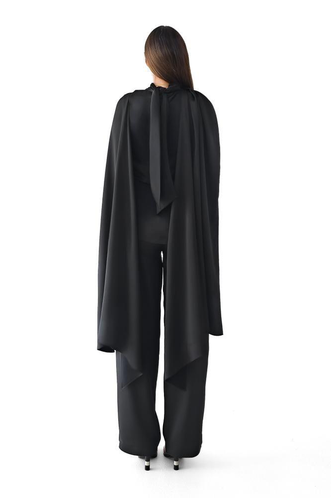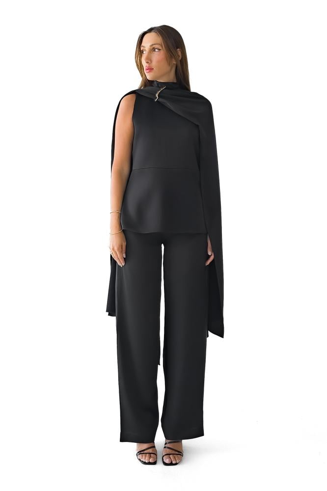 وصف المنتج: طقم من قطعتين توب بوشاح اسود مع بنطلون من كوليكشن عالية خليل ، يتميز التوب بقصة انسيابية ناعمة مرفق بوشاح طويل مخيط من الاكتاف ينسدل بأسلوب درامي أنيق على الاكتاف حيث يغطي الكتف بنعومة واضيف عليه اكسسوار ذهبي اللون ليعزز من الطابع الأنثوي الجريء دون تكلف ، كما يتميز البنطلون بقصة واسعة وطول انسيابي يلامس الأرض، ليخلق توازناً مثالياً مع التوب ويضفي حركة راقية لكل خطوة