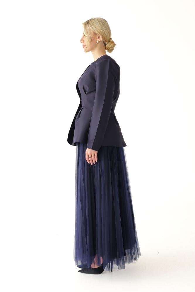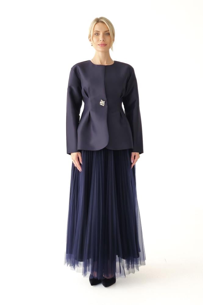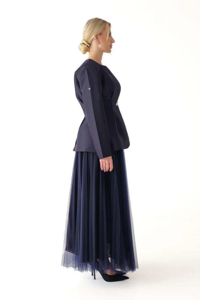 وصف المنتج: طقم من قطعتين جاكيت كحلي مع تنورة من كوليكشن عبايات علياء خليل ، يمتاز الجاكت بقصة البليزر الرسمية بخامة التفته الفاخرة، كما زين بأكسسوار ذهبي مثبت ( لايمكن ازالته ) ، تأتي معه تنورة بقصة كلوش بطبقات من قماش التل اعطت مظهر انثوي ، تتميز بتفاصيل الكسرات على كامل التنورة مما أضاف تأثير جذاب، كما تم تبطينها بقماش الشيفون ، تأتي معها طرحة من التل الشفاف .