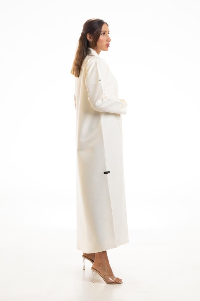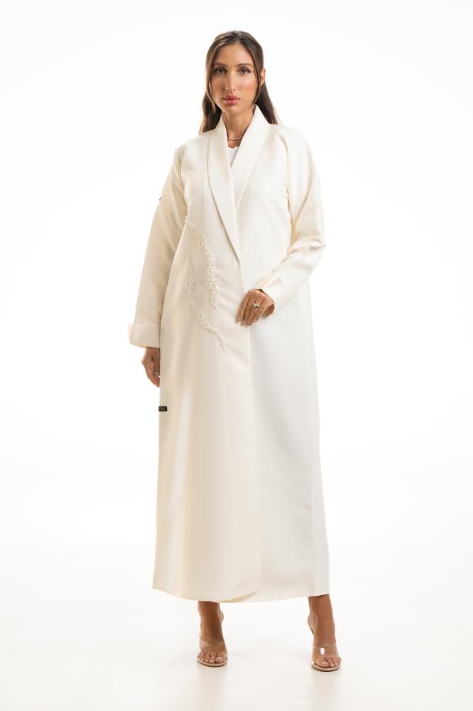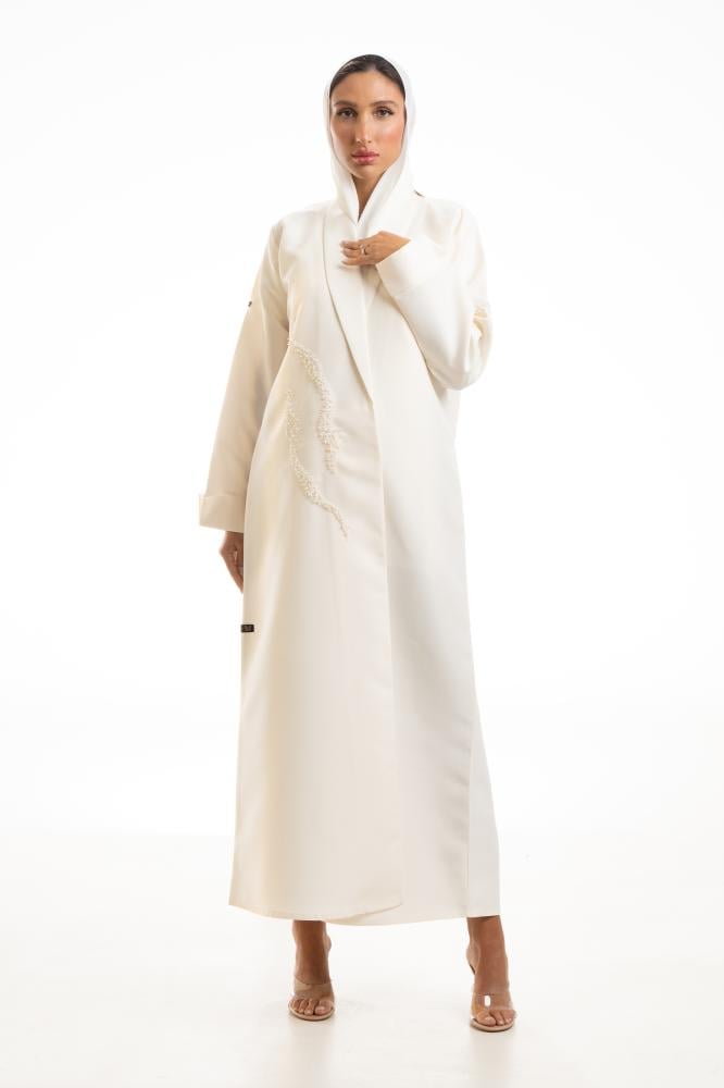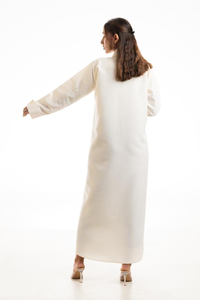 وصف المنتج : عباية أوف وايت فاخرة بقماش التفته من كولكشن عبايات ملكة كابلي ، صممت بياقة واكمام رسمية، طرزت ايضا بتطريز يدوي بالخرز في جانب واحد من العباية وكم واحد مما جعلها انيقة وملفتة في نفس الوقت ..