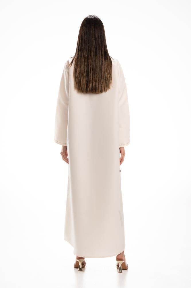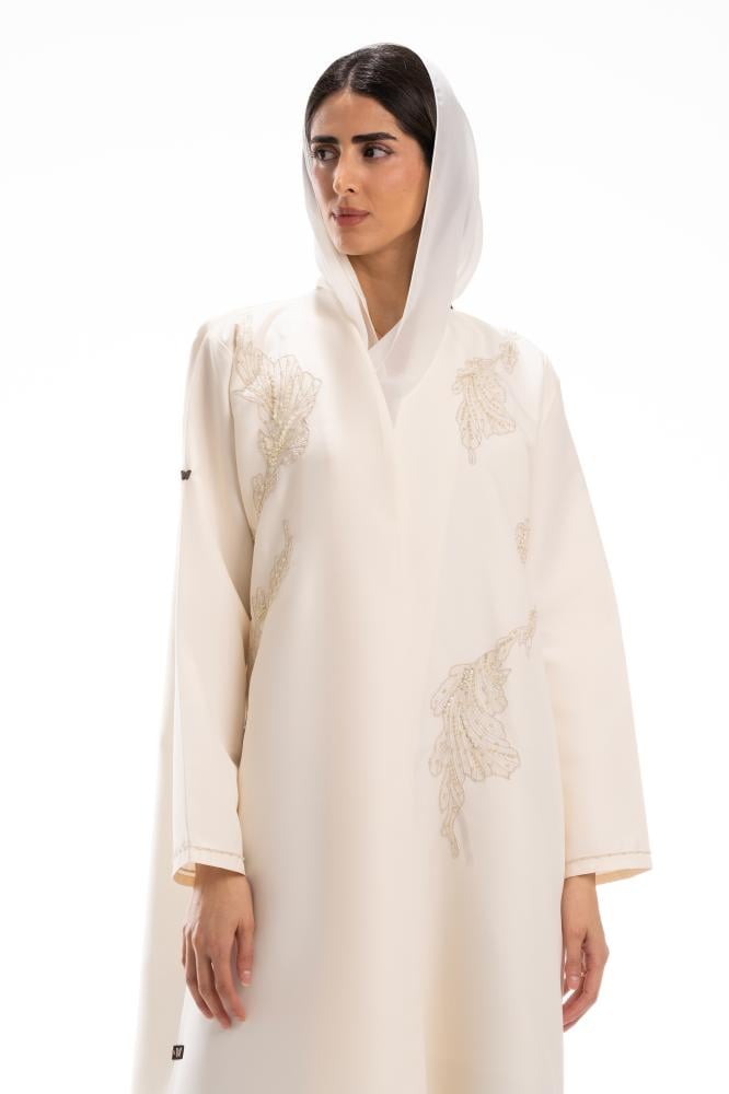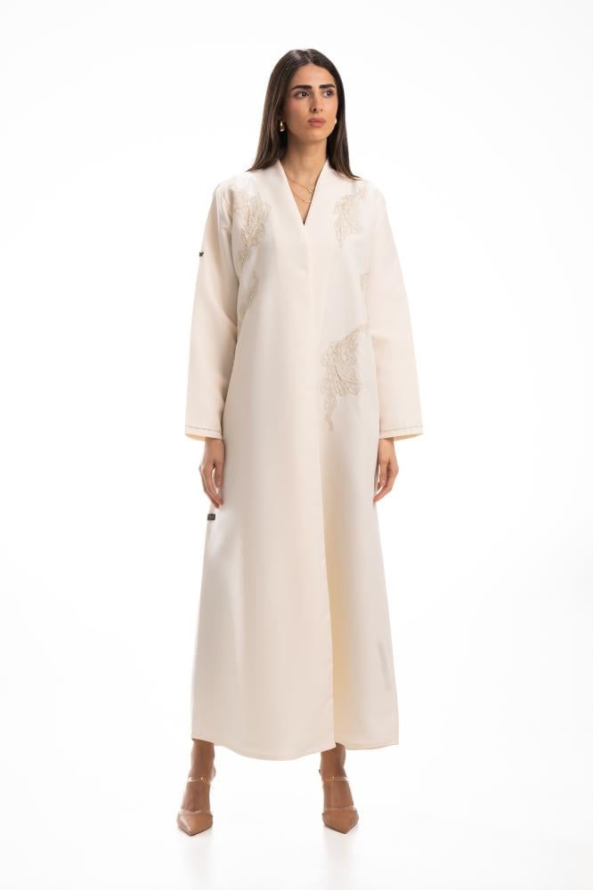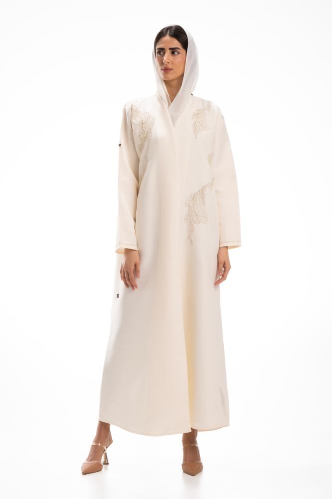 وصف المنتج : عباية أوف وايت فاخرة بقماش التفته ، اضيف لها خرز في امام العباية على شكل ورد كما طرز طرف الاكمام مما اعطاها مظهر بارز وملفت ..