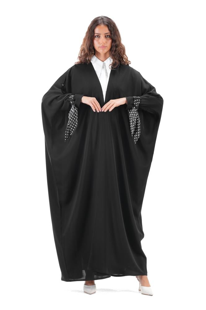 وصف المنتج : عباية بشت سوداء بقماش بنادورا الناعمة ، تميزت الاكمام بتفاصيل فريدة حيث زينت بشرائط منقطة باللون الأبيض حريرية قابلة للربط لتضفي لمسة انثوية كلاسيكية تجمع بين البساطة والفخامة ، هذه العباية خيار مثالي للمرأة التي تبحث عن تصميم عملي وراقي في آن واحد ..