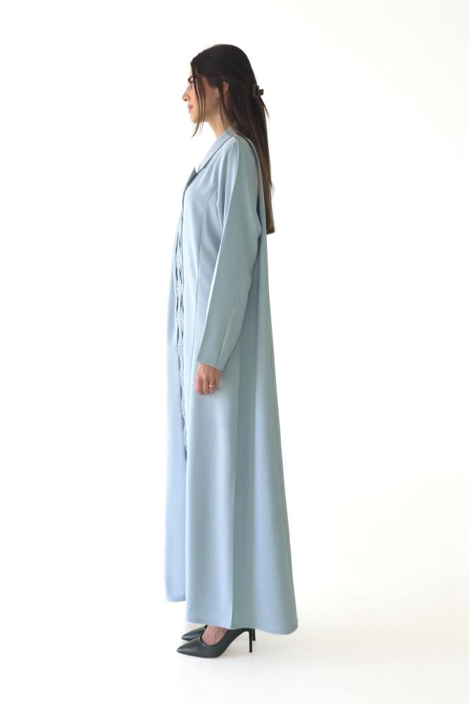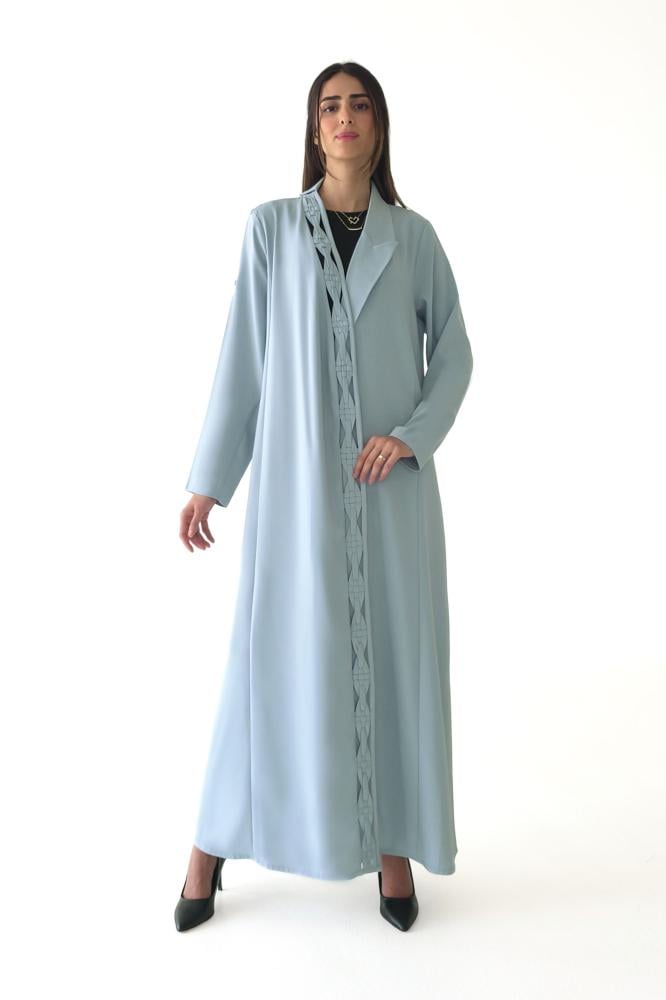 وصف المنتج : عباية بليزر سماوي بقماش كريب ويفي ، تمتاز العباية بقصة ياقة طولية من جهة ومن الجهة الاخرى زينت بخياطة فنية أنيقة على شكل جدائل معقودة تم تنفيذها من نفس الخامة منسدلة بشكل متناسق على طول الحافة هذا التفصيل يضيف لمسة مودرن وعصرية للعباية ، ويمنحها عمق وأناقة بدون أي تطريز مبالغ، مما يحافظ على رقيها وأناقتها في نفس الوقت