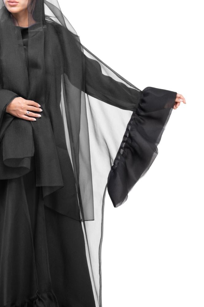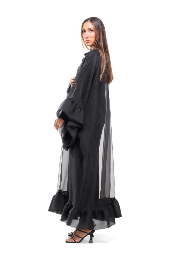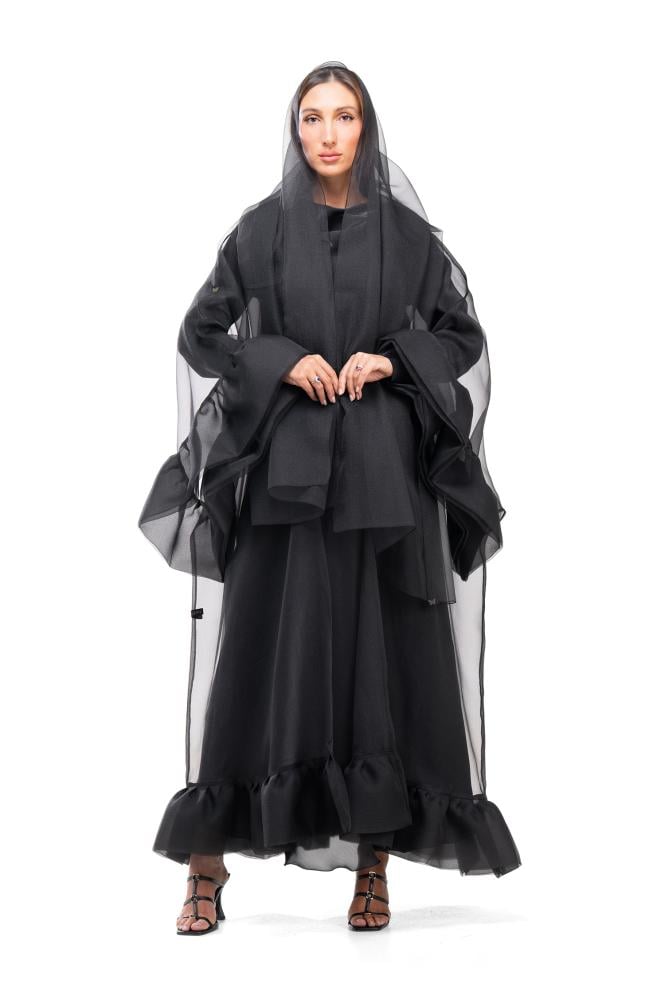 وصف المنتج: عباية سوداء فاخرة بقصة نصف بشت بقماش الأورقنزا ، تتميز هذه العباية بطبقات من القماش المثنية أو المجمعة من أسفل العباية والأكمام الواسعة اضافت لمسة مميزة على تصميم العباية ، كما يأتي معها فستان بأكمام طويلة بخامة الأورقنزا الحرير ، قطعة ملفتة للنظر وتعكس الأناقة والأنوثة والتصميم الفاخر ، فهي قطعة تضفي لمسة ساحرة على أي إطلالة ..