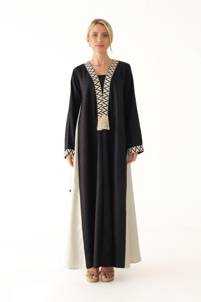 وصف المنتج : عباية سوداء صيفية أنيقة مصنوعة من خامة اللينن الخفيفة والمريحة، بتصميم A-Line يمنحك إطلالة راقية وانسيابية. تم دمج خامة الجاكار الفاخرة باللون البيج بأسلوب أنيق يضفي لمسة فخامة عصرية، مع كلفة فاخرة على الياقة والأكمام لمزيد من التميز. مثالية للإطلالات اليومية والمناسبات، حيث تجمع بين الراحة والرقي بأسلوب راقٍ وجذاب.
