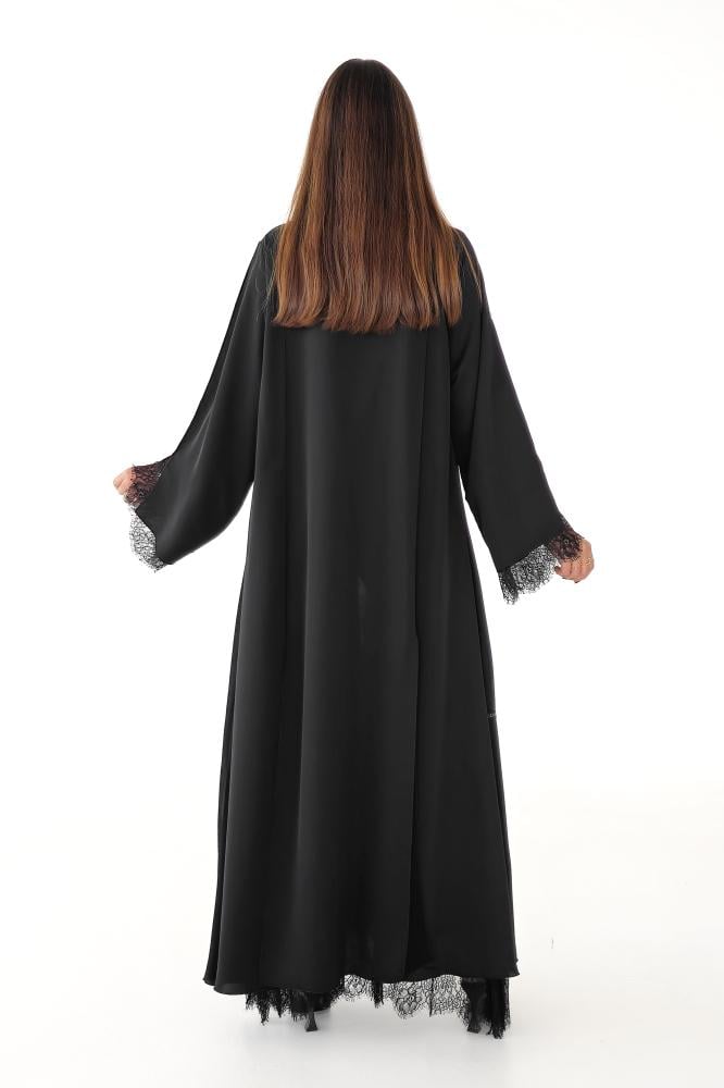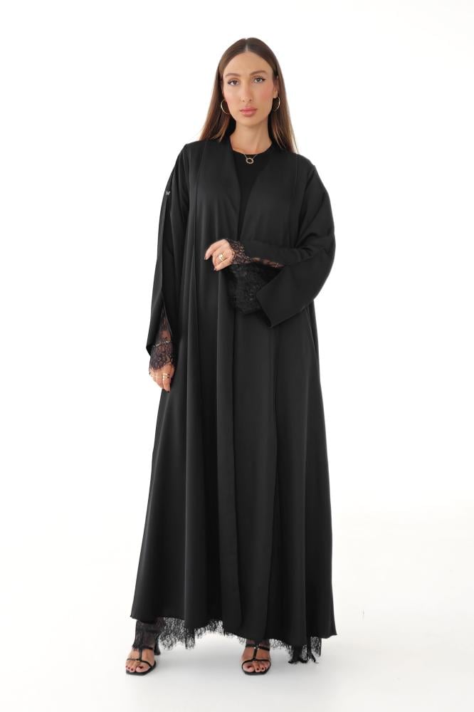 وصف المنتج: عباية سوداء فاخرة بقصة كلوش أنيقة اضافت لمسة من الانسيابية ، تتميّز بلمسات أنثوية راقية تبرز في بطانة الدانتيل الفاخرة والظاهرة على أطراف الأكمام وأسفل العباية ، كما صممت بفتحات أنيقة تضيف مرونة في الحركة دون المساس بجمال التصميم وأناقة في التفاصيل لتكون خيارك المثالي للمناسبات الخاصة والإطلالات اليومية الراقية ..