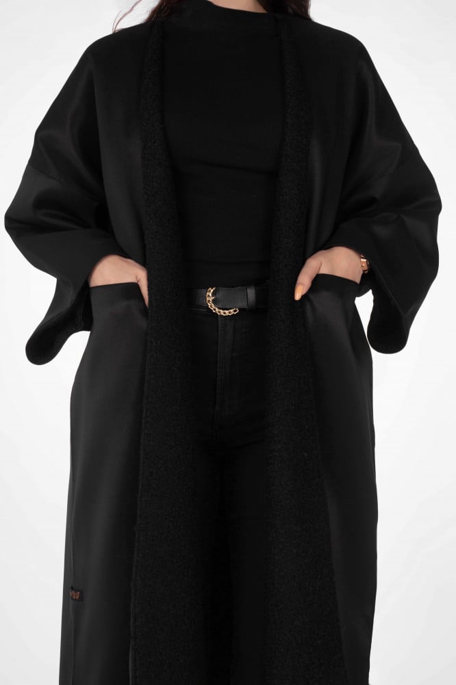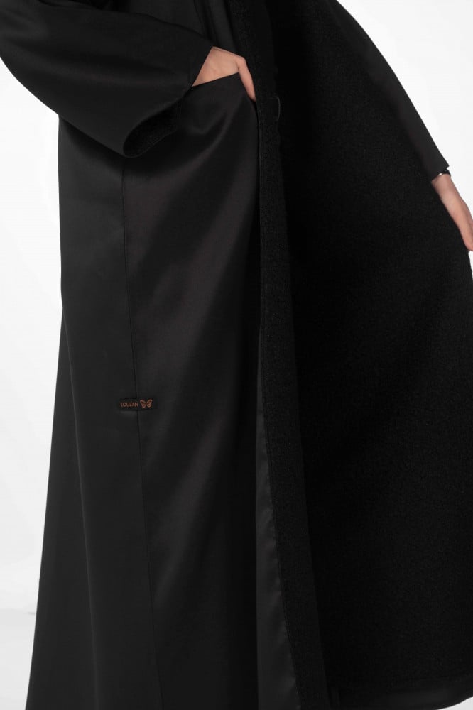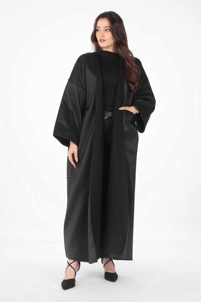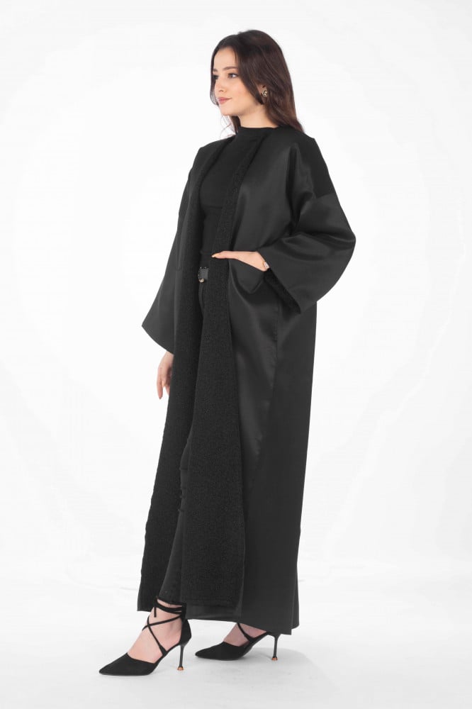 وصف المنتج: عباية شتوية بقماش التفتة ستان صممت بطريقة عصرية ، مبطنة بالكامل بالصوف مع اضافة جيوب امامية ..