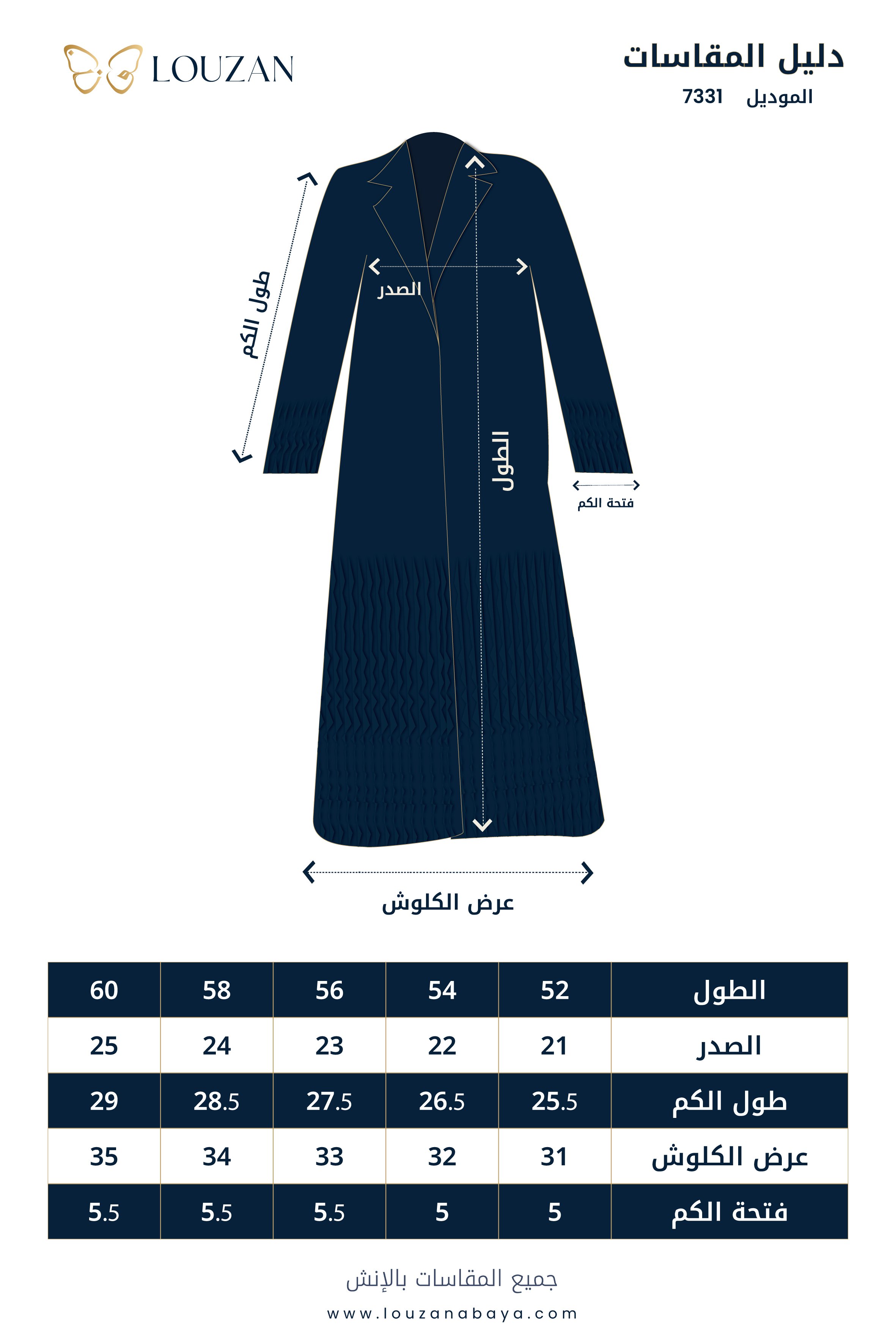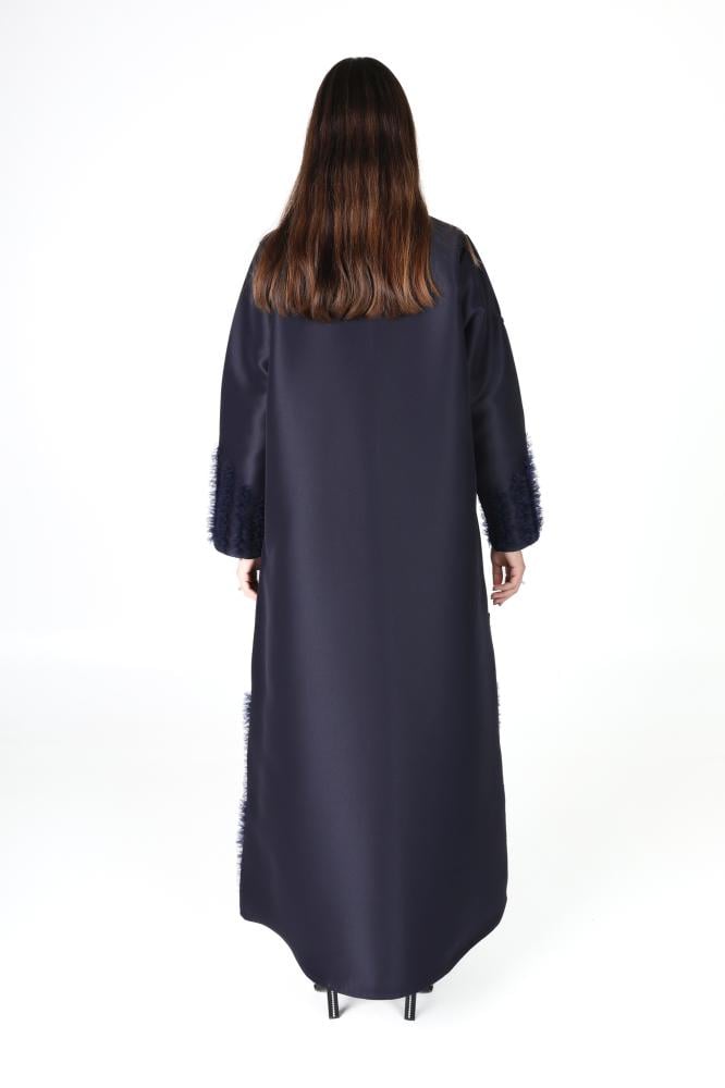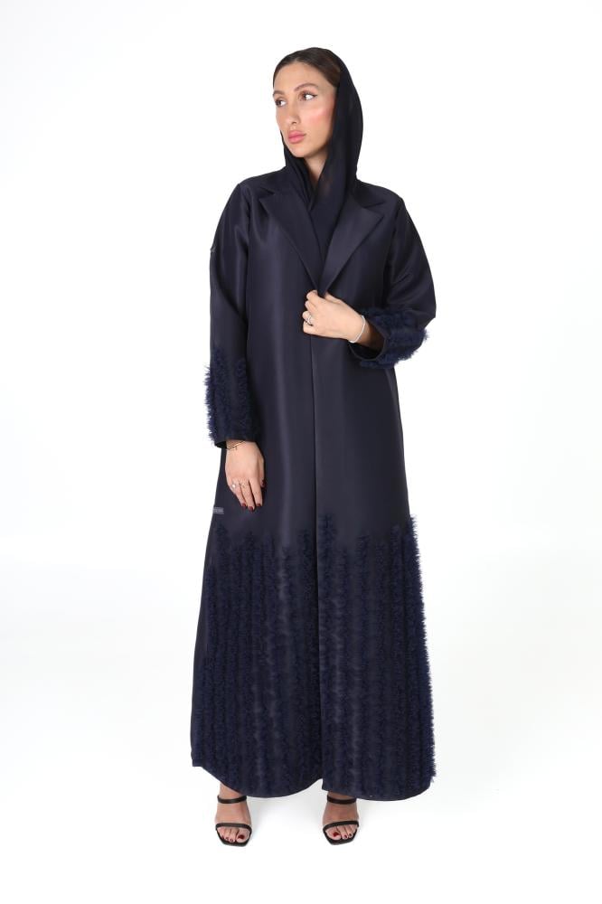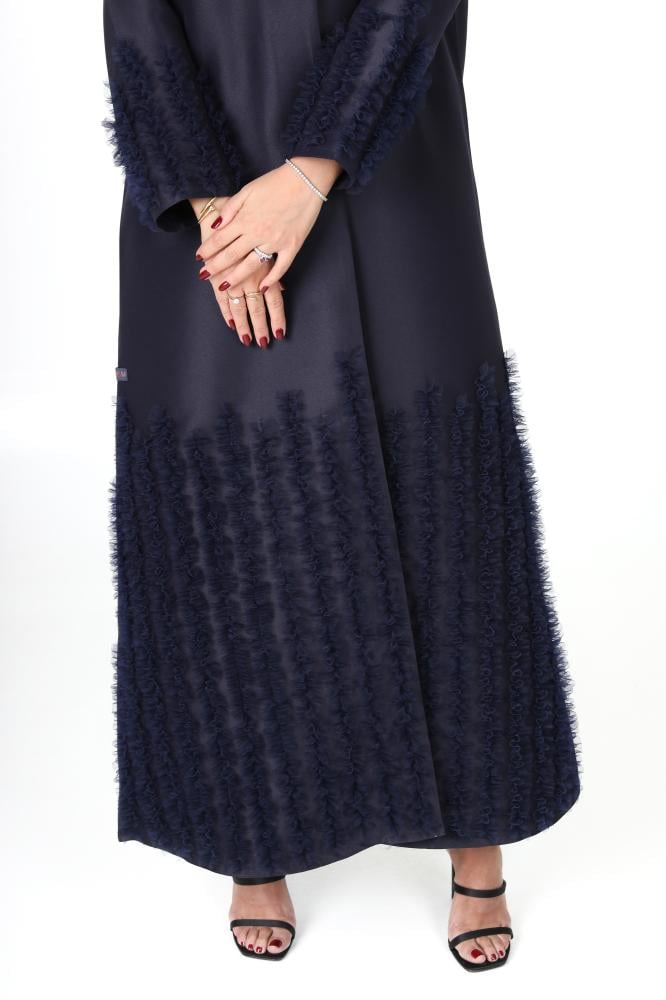 وصف المنتج : عباية كحلية فاخرة بقماش التفته، بقصة انيقة بياقة طولية كما زُينت بقصاصات من التل موزعة ومرتبة بطريقة متدرجة ومنسقة بدقة بشكل ملفت على الأكمام وأسفل العباية، مما اعطها لمسة راقية وحيوية تلفت الانتباه وتبرز جمال العباية
