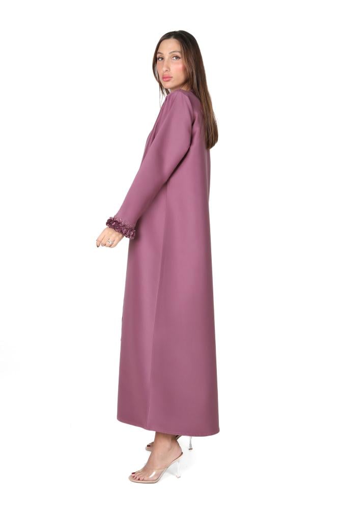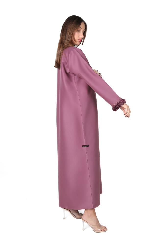 وصف المنتج: عباية موف بقماش التفته ، بقصة مفتوحة اضيف لها مرد داخلي وربطة جانبية داخلية ، طرزت بتطريز يدوي بالخرز والخيوط في نهاية الكم كما اضيفت لها قصاصات ليزرية بخامة مختلفة اعطى لها مظهر انثوي ناعم