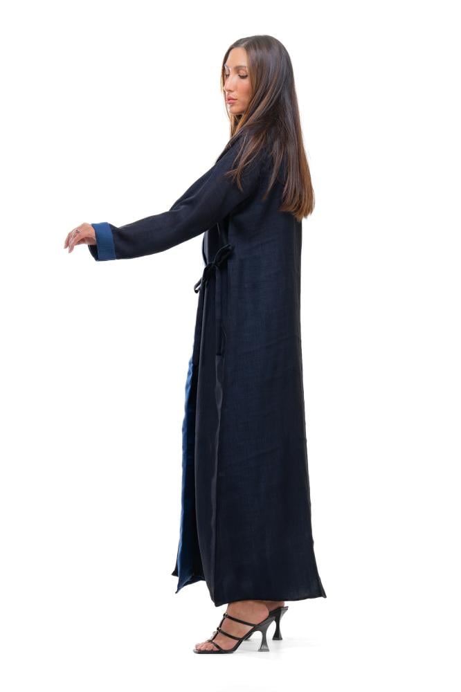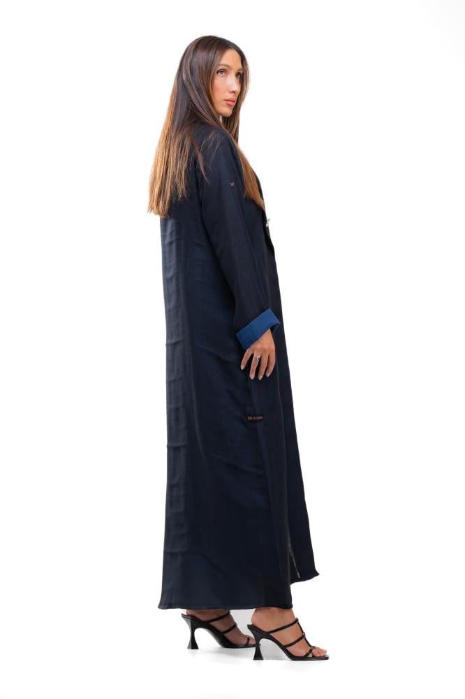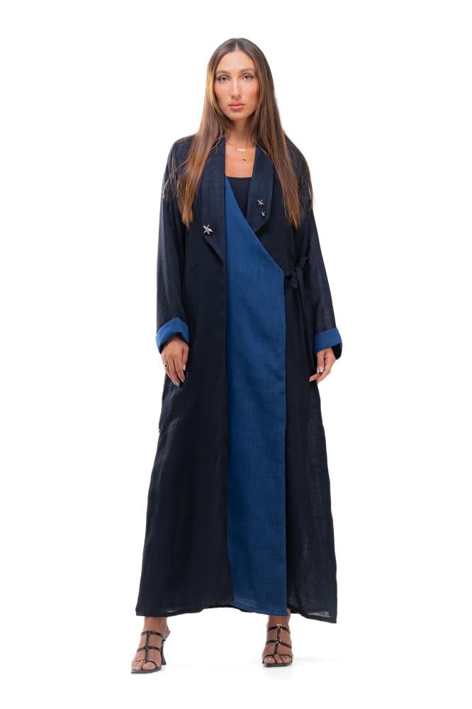 وصف المنتج : عباية بليزر صيفية بقماش اللينن ، بلونين متناسقين الأسود والكحلي صممت بتصميم راقي يبرز جمال التفاصيل حيث تتميز بياقة طولية كما أضيفت لمسة من الفخامة بإكسسوار ذهبي على شكل نجم البحر مع ربطة جانبية أنثوية تكمّل التصميم ، تعكس هذه العباية قدرة المرأة على النمو والتأقلم مع التغيّرات المستوحى من قوة نجم البحر كما تعكس خفة وأناقة مثالية لأيام الصيف