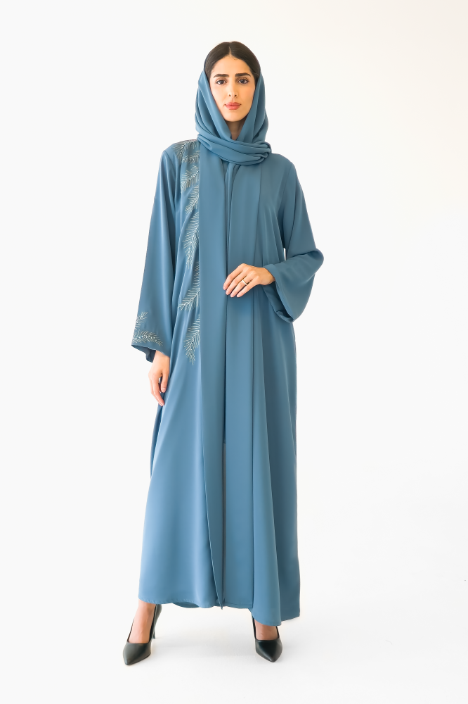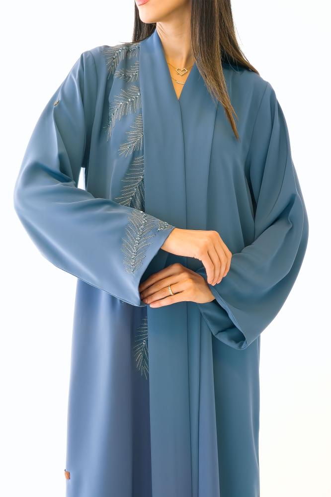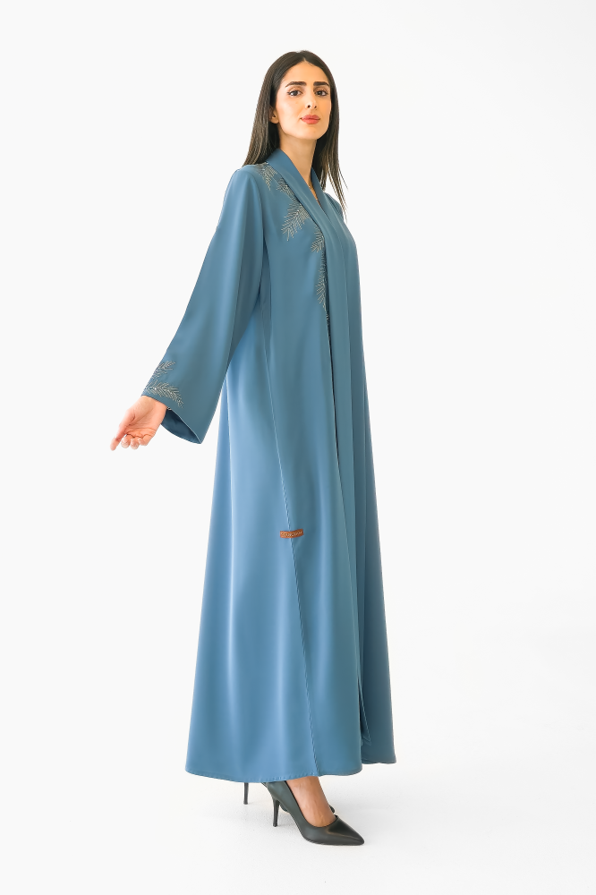 وصف المنتج : عباية تركوازية بقماش باندورا ، طرزت بالخرز والخيوط في جانب واحد من العباية وطرف الكم بشكل مستوحى من الطبيعة على شكل ورق شجر مما منحها طابعاً أنيقاً مع جاذبية لا تُقاوم ..