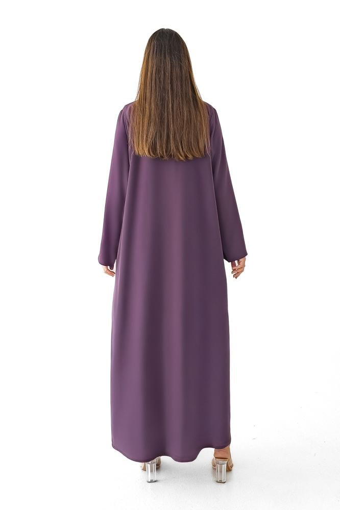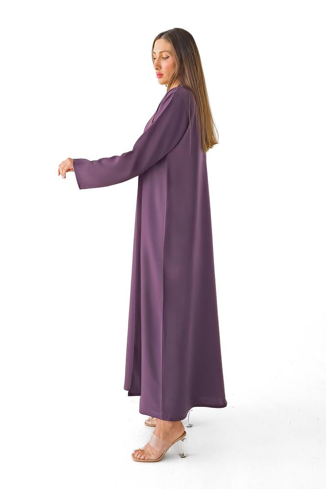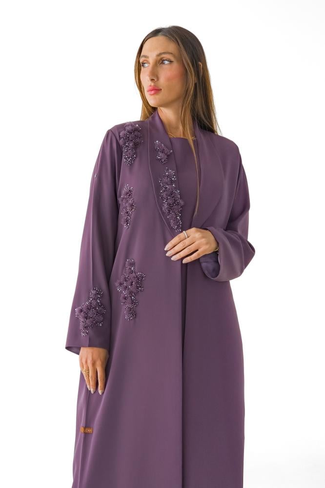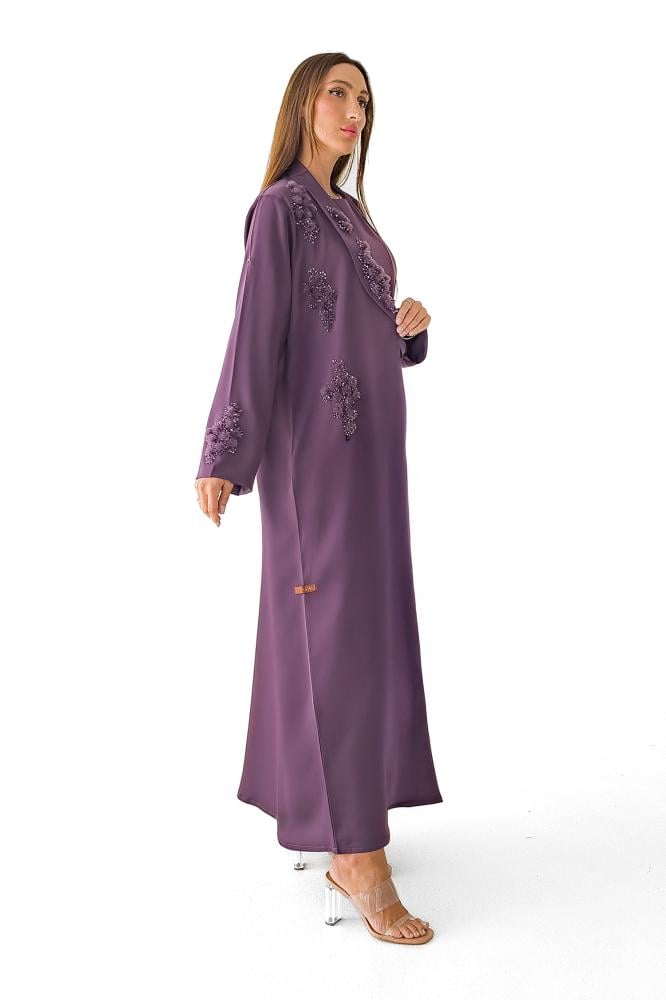 وصف المنتج : عباية بنفسجية بقماش كريب ويفي ، صممت بياقة طولية وطرزت بالخرز بتطريز يدوي في جانب واحد من العباية مع جزء من الكم مما منحها طابعاً أنيقاً مع جاذبية لا تُقاوم كما يأتي معها فستان يربط من الخلف بحزام بنفس الخامة