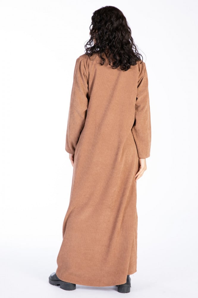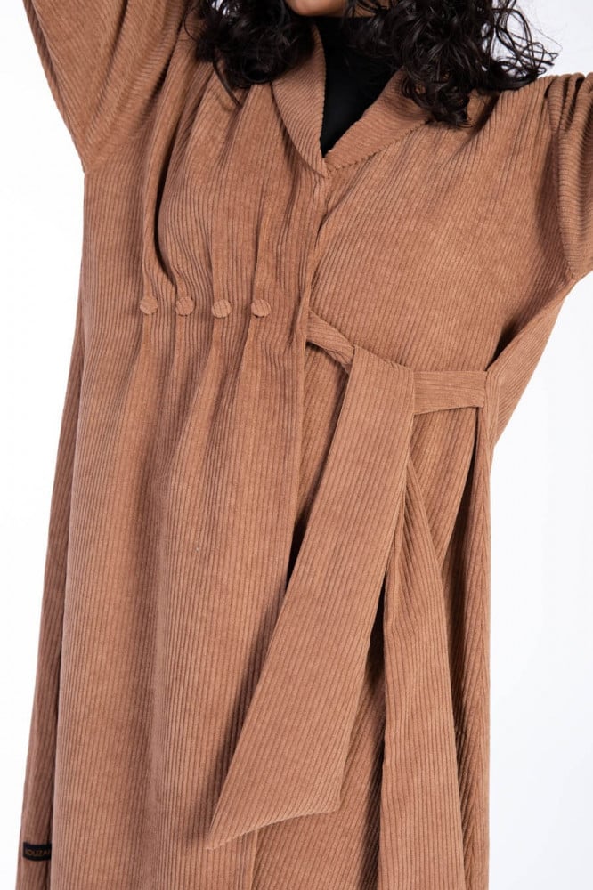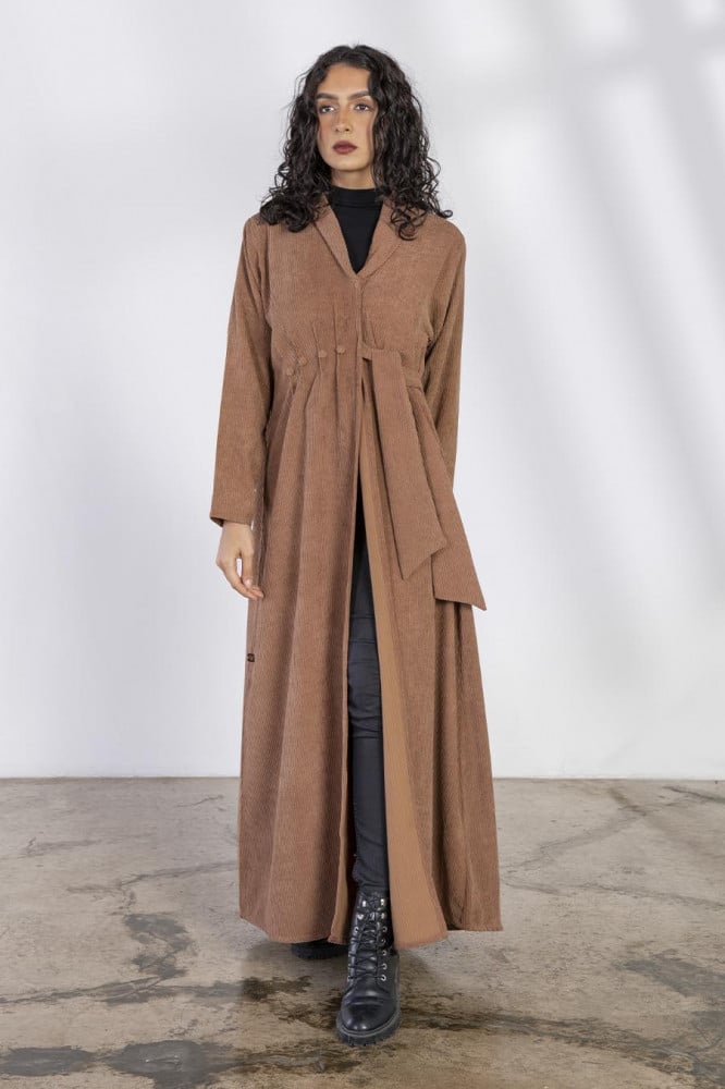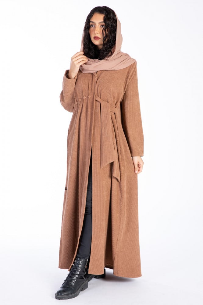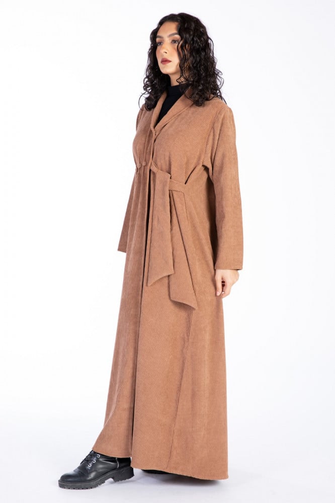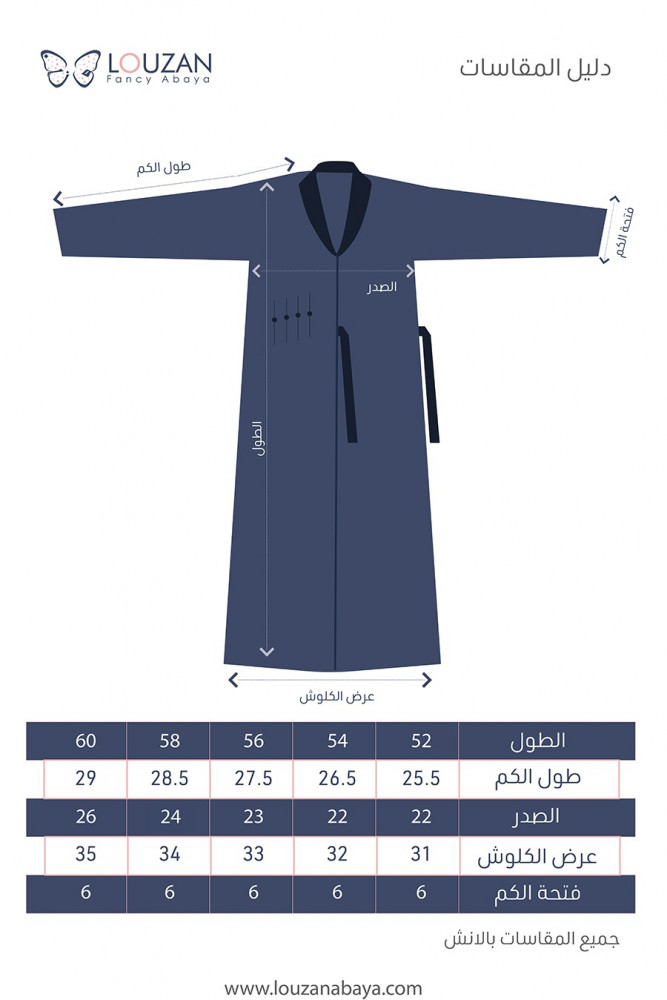 وصف المنتج: عباية بقماش اللينز فيلفت بقصة عادية ، يوجد بها طقطق واحد بالأعلى مع اضافة حزام على جانب العباية ، اضيفت لها ازارير زينة.