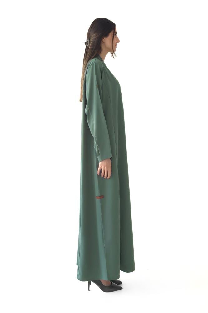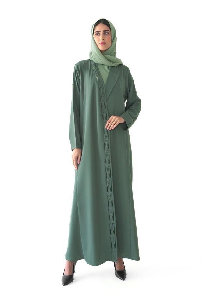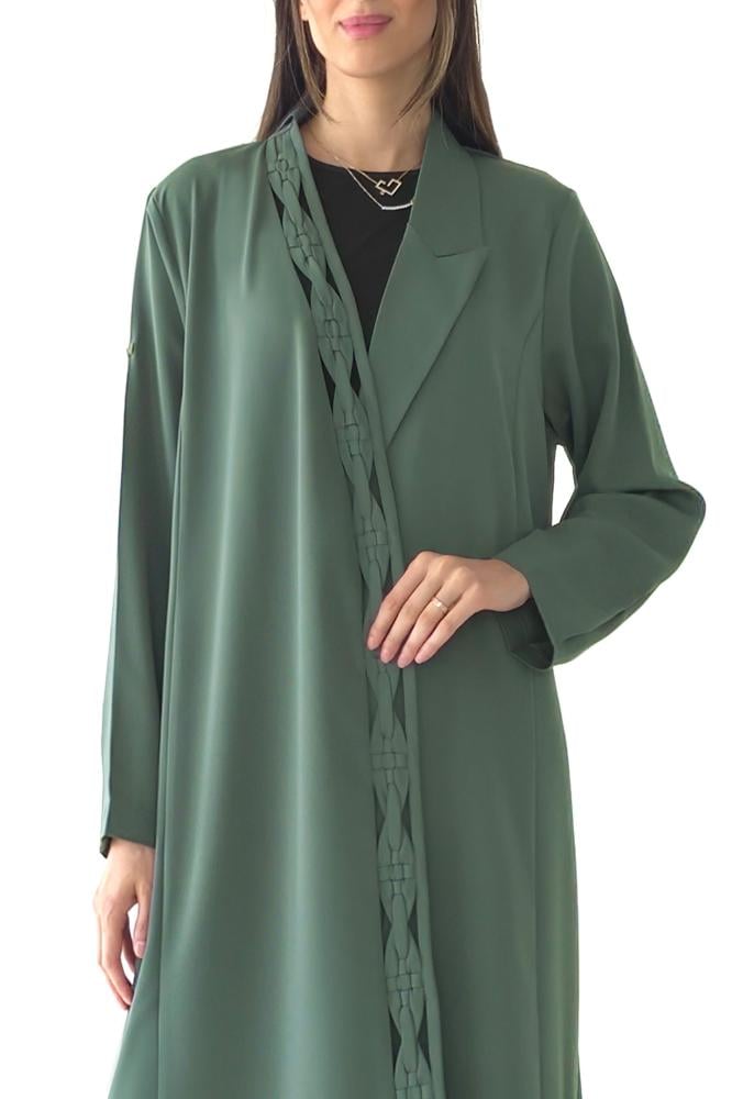 Product Description: Green blazer abaya in wavy crepe fabric. The abaya features a longitudinal collar on one side and on the other side it is decorated with elegant artistic stitching in the form of knotted braids executed from the same material, falling in a harmonious manner along the edge. This detail adds a modern and contemporary touch to the abaya, and gives it depth and elegance without any exaggerated embroidery, which maintains its sophistication and elegance at the same time.