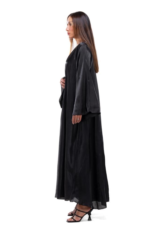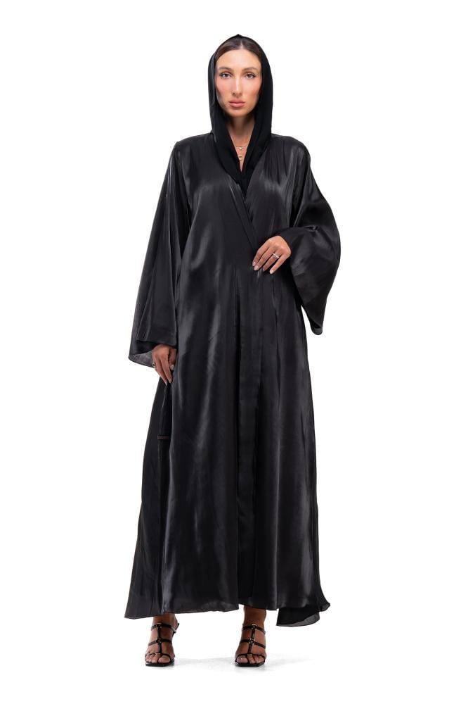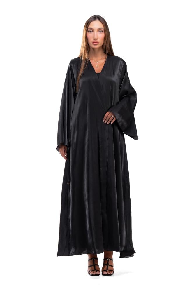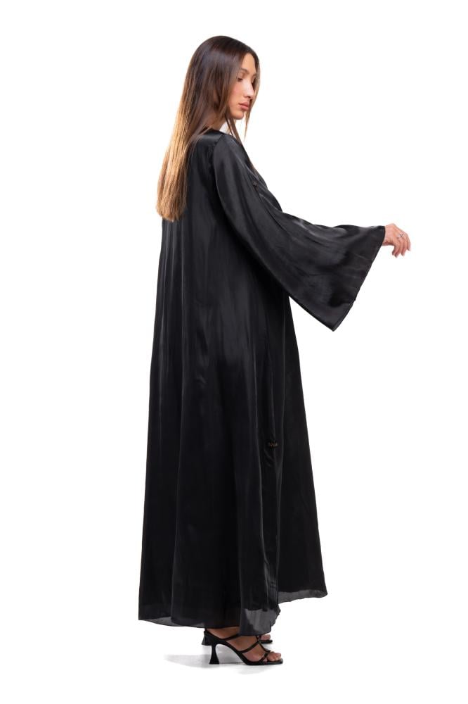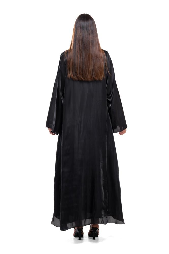 Product Description: A soft and luxurious black abaya made of silk organza fabric . The abaya features a wrap-around cut and wide sleeves with a soft sheen of fabric that highlights the beauty of the abaya and adds a feminine touch to the overall look.