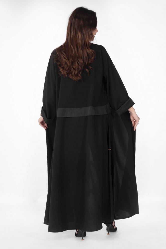 Product Description: A black abaya made of English Pro crepe fabric with a cloche cut. Another material was inserted on the collar, sleeves and in the middle of the abaya, with the addition of decorative buttons..