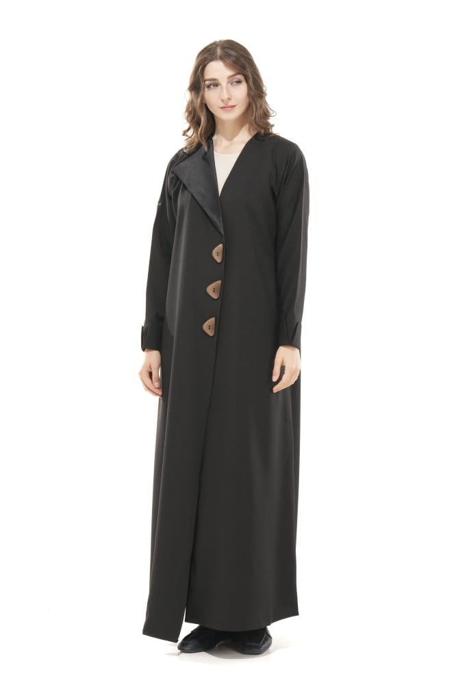 Product Description: Black abaya made of English crepe fabric, featuring a single collar, formal sleeves and the addition of gold-coloured decorative buttons.