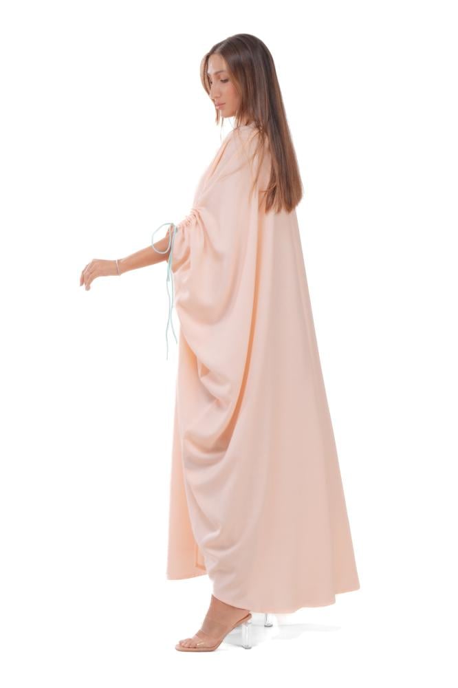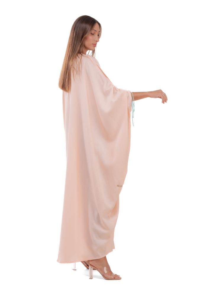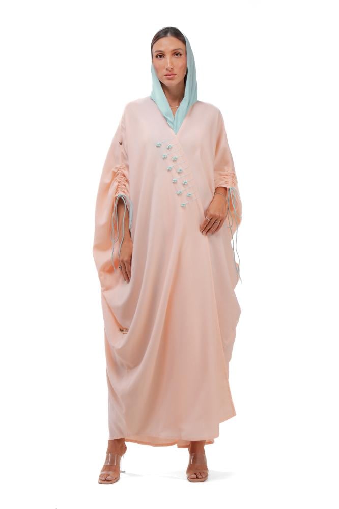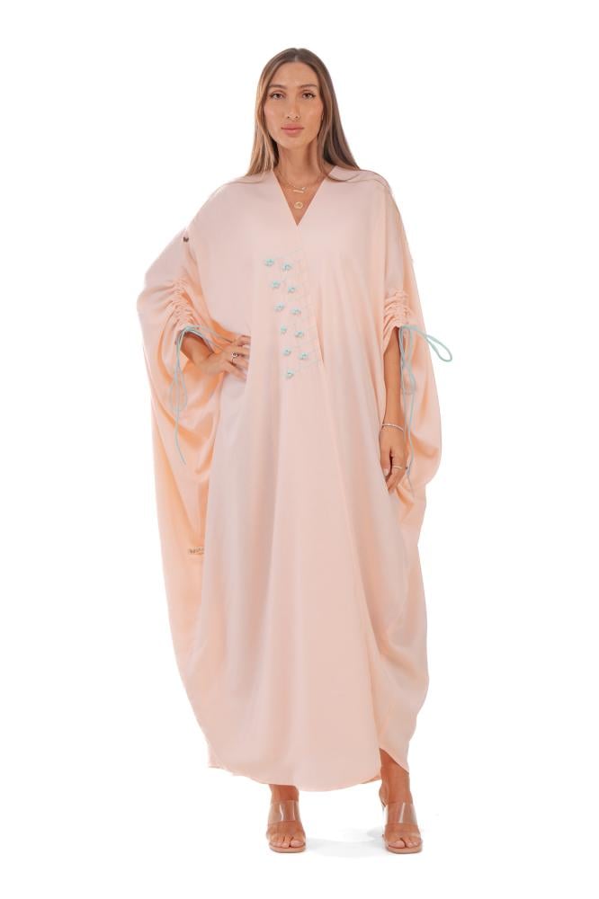 Product Description: A summer abaya with a bisht cut, made of linen fabric, decorated with Tiffany-colored threads on the sleeves of the abaya, with the possibility of gathering the sleeves. It is also hand-embroidered on one side of the abaya, giving a fresh and cheerful summer look.