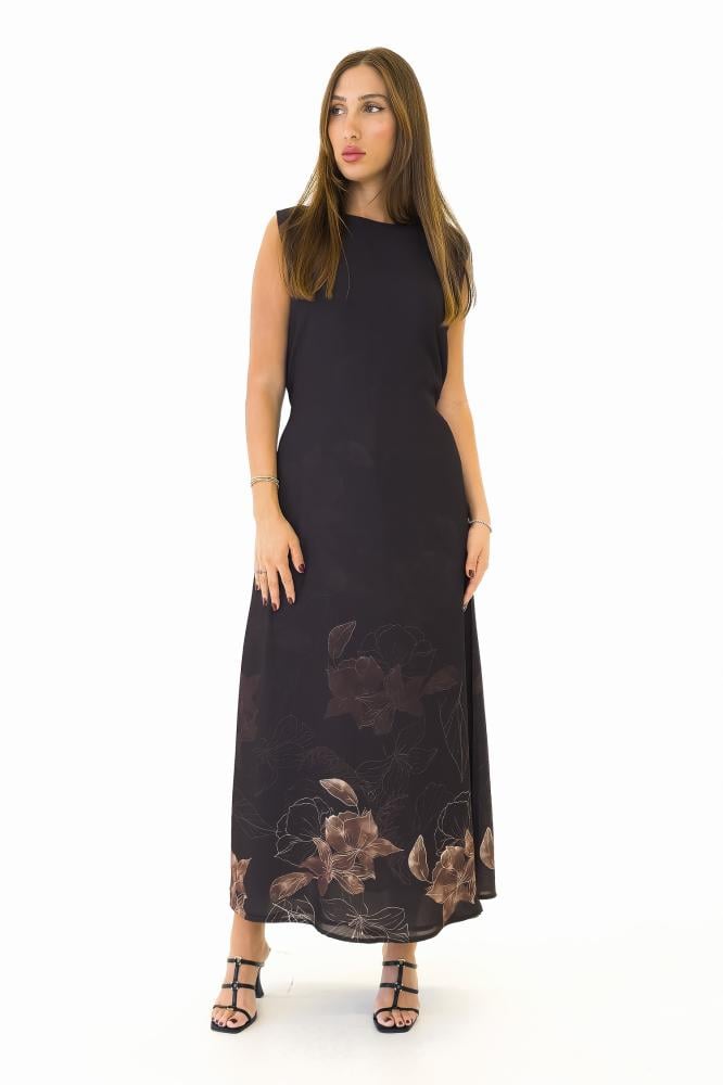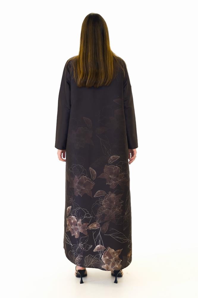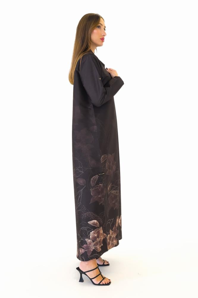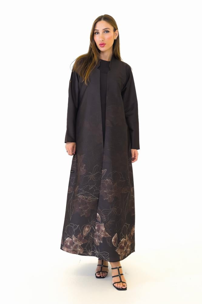 Product Description: Brown abaya with a taffeta dress, comes with a waist dress in the same color and material with a belt tied at the back, featuring floral prints with touches inspired by nature, giving it a bright, lively feminine character that suits a bold and elegant look