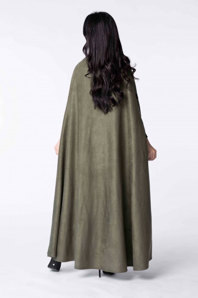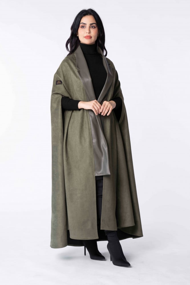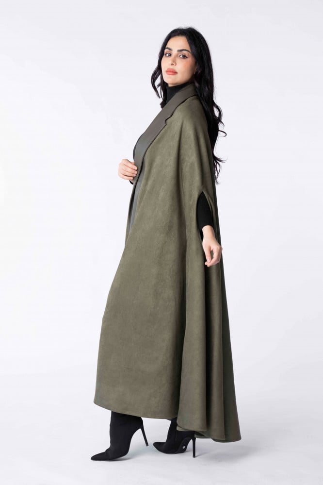 Product Description: A suede winter abaya with a cut (robe - cape), designed in a modern way by adding leather to it, which gave it a sophisticated winter look..