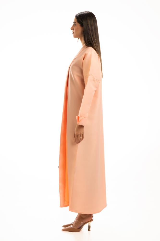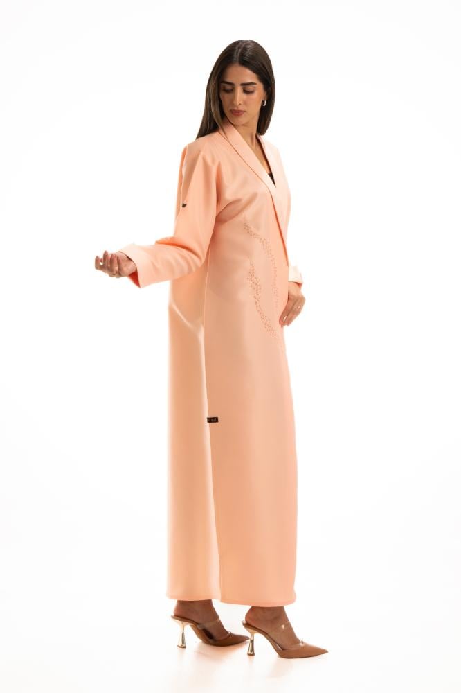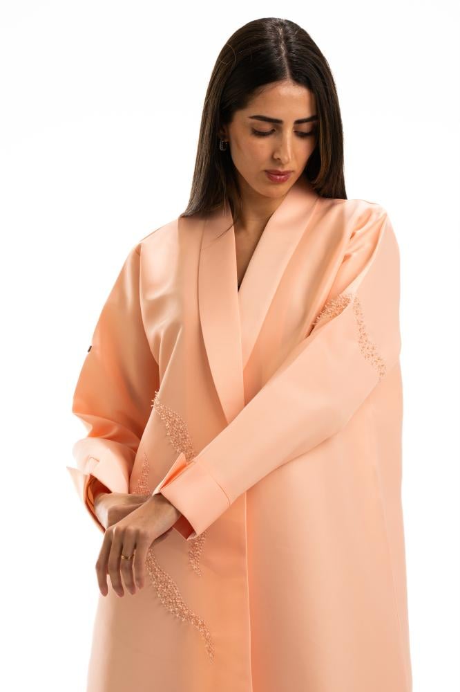Product Description: Luxurious Kharbazi abaya made of taffeta fabric from Malika Kabli's abaya collection. Designed with a formal collar and sleeves, it is also embroidered with hand beads on one side of the abaya and one sleeve, making it elegant and eye-catching at the same time.